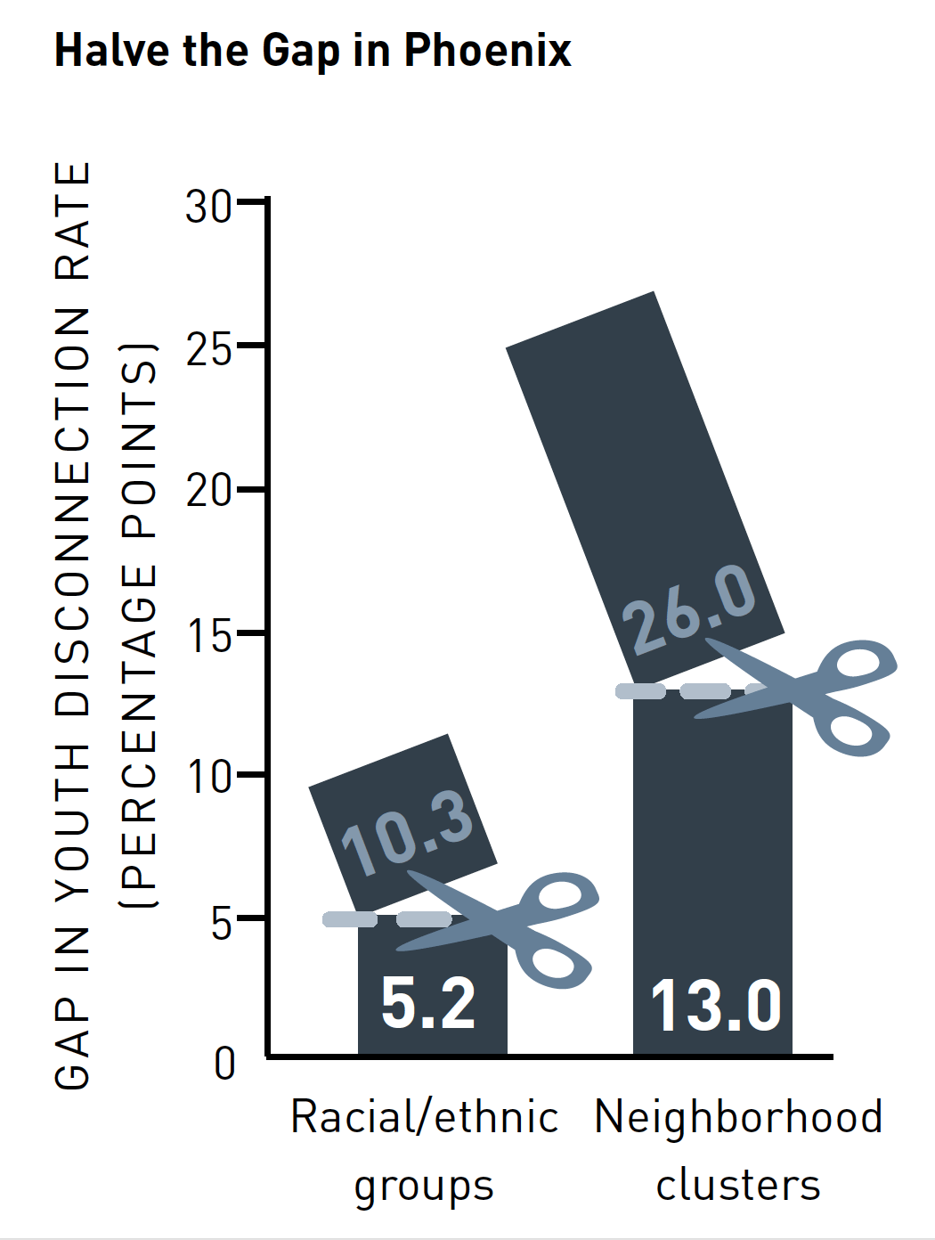 This report is a follow up on an initial report published in 2012 on youth disconnectedness (youths not in school and not working) in US cities. I came up with this infographic to best capture the core message of the report — a call to arms to halve the gap between racial/ethnic groups and neighborhood clusters by 2030. The report has been cited in numerous news outlets, including the New York Times, Bloomberg Businessweek, and more. To download the report for free, click here.