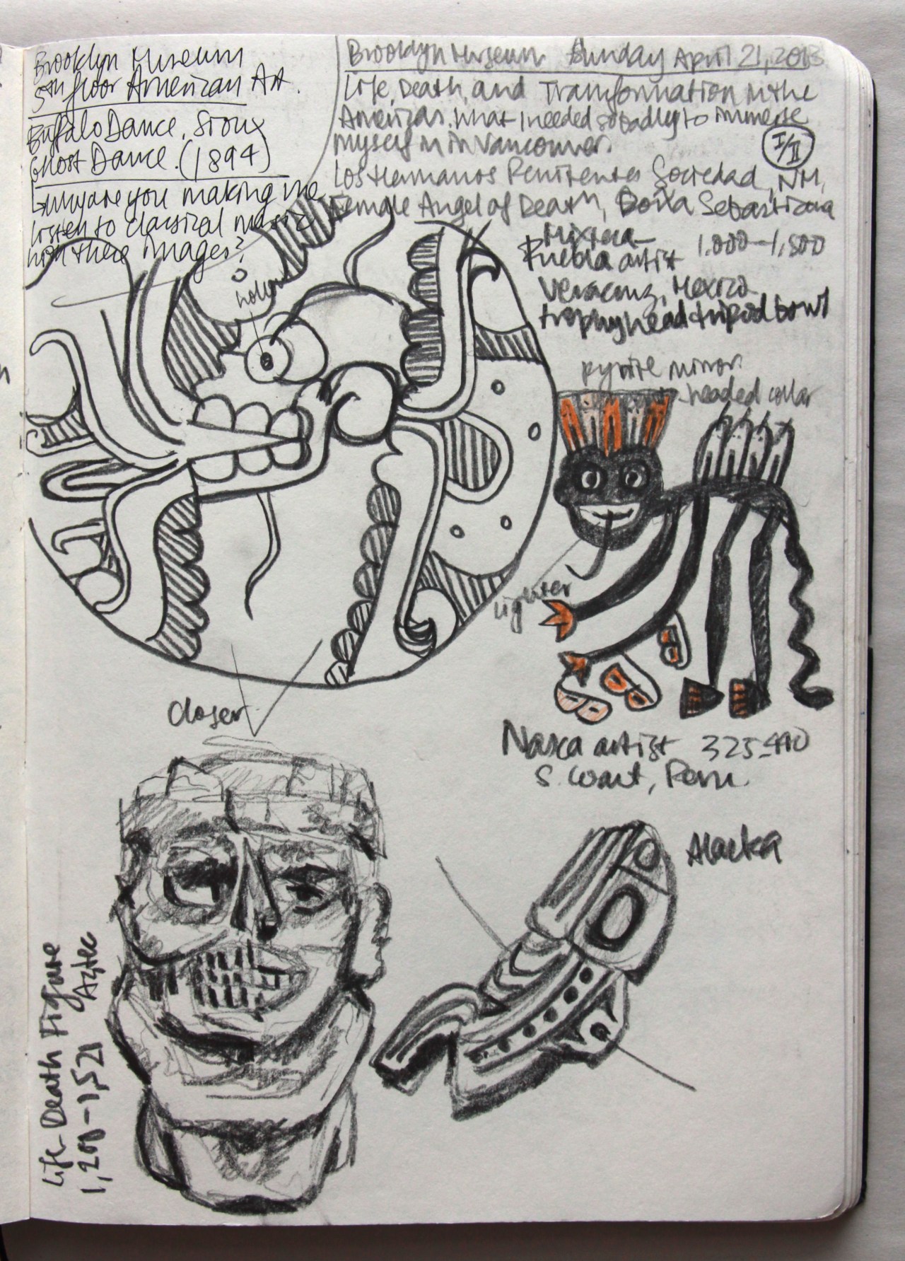 These sketches are from the “Life, Death, and Transformation in the Americas” exhibit at the Brooklyn Museum, NYC. The items are from the permanent collection, and the exhibit is an exquisite display of objects from a wide array of eras and locales. Seeing all the pieces its quite incredible to think about the artists weaving, carving, and painting these intricate meaning-laden objects.