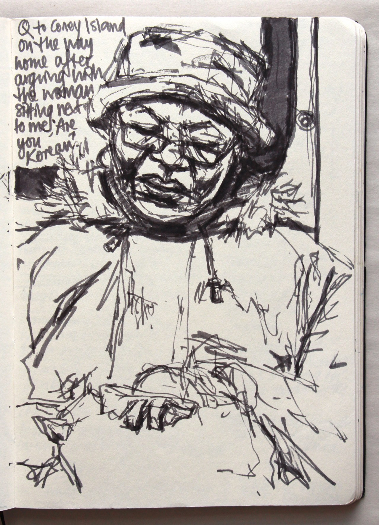 When I used to live on the Q train I loved being able to sketch strangers on the train. The journey over the Manhattan Bridge and the long gaps between stops were perfect for quick sketches as people sometimes snoozed or were just too engrossed in their own thing to notice.