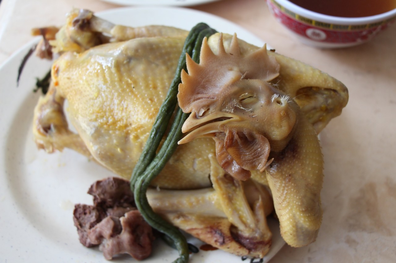 Chinese New Year* this year fell on January 31st, preceded by a week of shopping and preparations in my house. I went with my mother all over Melbourne (namely Springvale, Footscray and Box Hill) to find the chickens, which have to be fully intact when you put them out on the prayer table. This is one of the two chickens she bought and steamed at home. Mum saw me getting ready to take photos, and she quickly draped the chicken with some Chinese Long beans* to give it some colour. The dark pieces in the front are the liver and kidney.