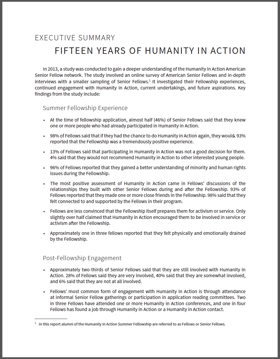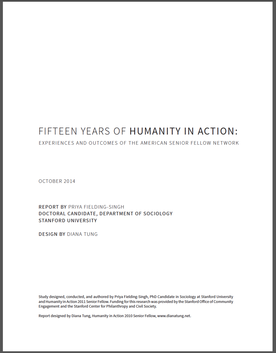 This report was designed and edited for the NY-based Humanity In Action to mark the human rights organisation’s fifteenth year. The 31-page report details the impact of Humanity In Action’s programs on participants, and includes survey and interview data regarding their experiences.